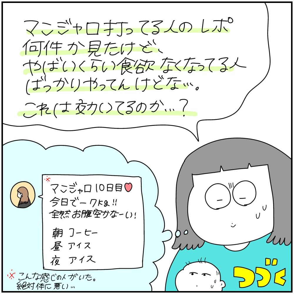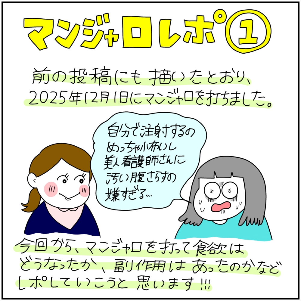 マンジャロレポ【1】2026.01.11ダイエット 前回の話↓ 産後太りで膝がぶっ壊れた話11広告 あとがき結構危ないダイエットされてる方も多くて勝手に心配してしまいました…!レポ続きます! 22 同じカテゴリの記事 マンジャロレポ⑥ マンジャロこばなし マンジャロレポ【5】 マンジャロレポ【4】 マンジャロレポ【3】 マンジャロレポ【2】 マンジャロレポ【1】 産後太りで膝がぶっ壊れた話11 産後太りで膝がぶっ壊れた話10 前の記事 オネエと水族館に行った話 2026.01.08次の記事 ボタンインコのちゅん太くん 2026.01.13アプリなら通知ですぐ読める! NAPBIZブログ